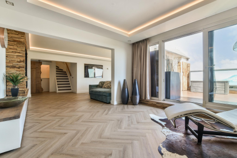 Aan de achterzijde van de woning bevindt zich de ruime woonkamer met toegang tot het balkon over de gehele breedte van het appartement. Dankzij de grote raampartijen is er veel natuurlijke lichtinval.